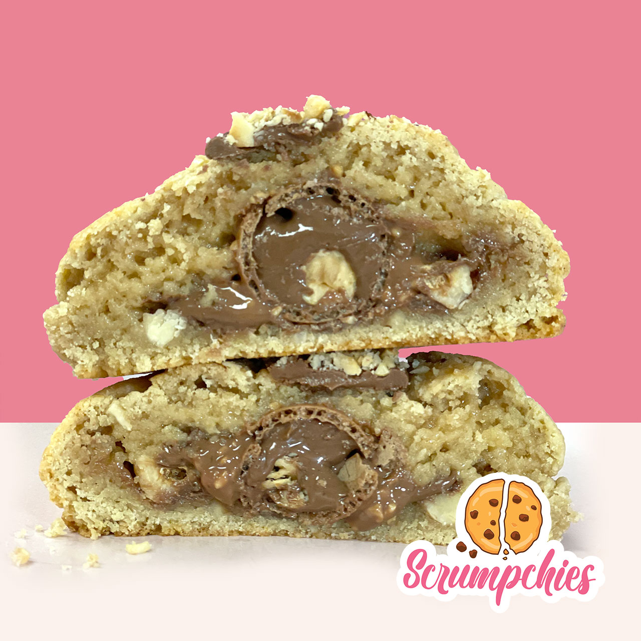 A golden, chunky NY-style cookie with roasted hazelnuts, a Ferrero Rocher core, and a gooey Nutella middle.